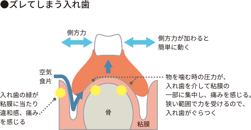 | 痛み | ものを噛むときの圧力が、粘膜の広い部分に分散するので、痛みが少ない ※下記「精密に型取りした入れ歯」参照 | ものを噛むときの圧力が、入れ歯を介して一部に集中して、痛みを感じる ※下記「ズレてしまう入れ歯」参照 |
