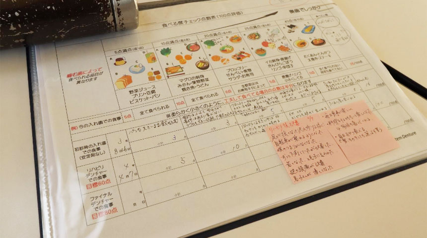 「KGKデンチャー」(上記画像右)だと、まず本番の入れ歯の前に「リハビリ入れ歯」(上記画像左)で衰えた筋肉や噛み合わせの左右差を元に戻す、そうすると点数が目に見えて上がっていきます。