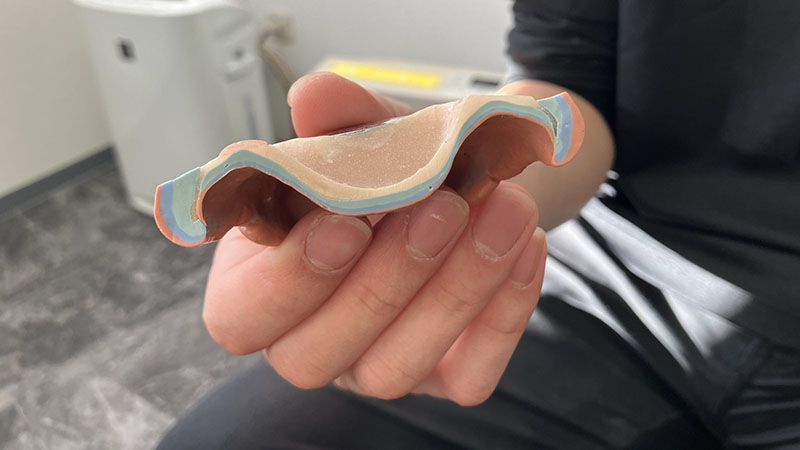これが口の中のコピーなので、この上に載せるイメージで入れ歯を作っていきます。