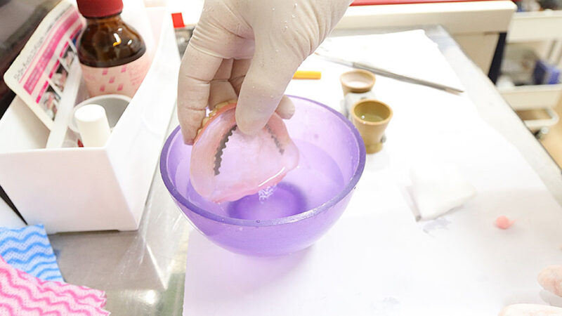 隙間を埋める素材は、固まる前の状態では辛く感じるらしく「辛いの入りますよ」と一言添えて口の中に入れ歯を入れる。